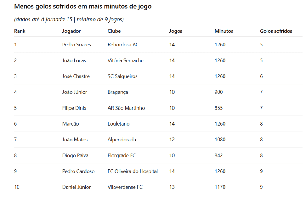 Alexandre Manão|Com esse enquadramento, decidimos valorizar os guarda-redes que melhor combinaram poucos golos sofridos com elevada utilização, recorrendo a um critério simples e transparente: menos golos sofridos e mais minutos de jogo, considerando apenas jogadores com pelo menos nove jogos realizados.